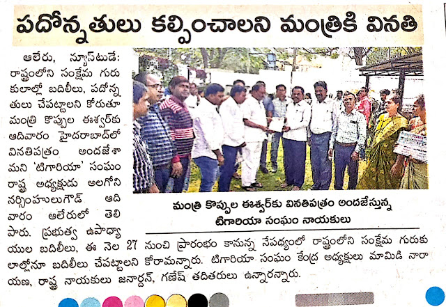 రాష్ట్రం లో ప్రభుత్వ ఉపాధ్యాయుల బదిలీలు ఈనెల 27 నుండి ప్రారంభం అవుతున్న దశలో సంక్షేమ గురుకులాల్లో కూడా  ప్రమోషన్స్, బదిలీల షెడ్యూల్ విడుదల చేస్తామని గౌరవ మంత్రివర్యుల ద్వారా హామీ పొందటం జరిగింది.