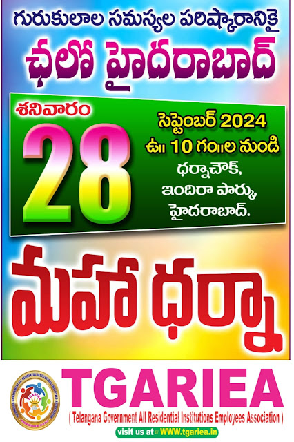 ఈ నెల 28 న గురుకుల సమస్యల సాధనకై హైదారాబాద్ లో మహాధర్నా కార్యక్రమం చేపడుతున్న విషయం తెలిసిందే!!!